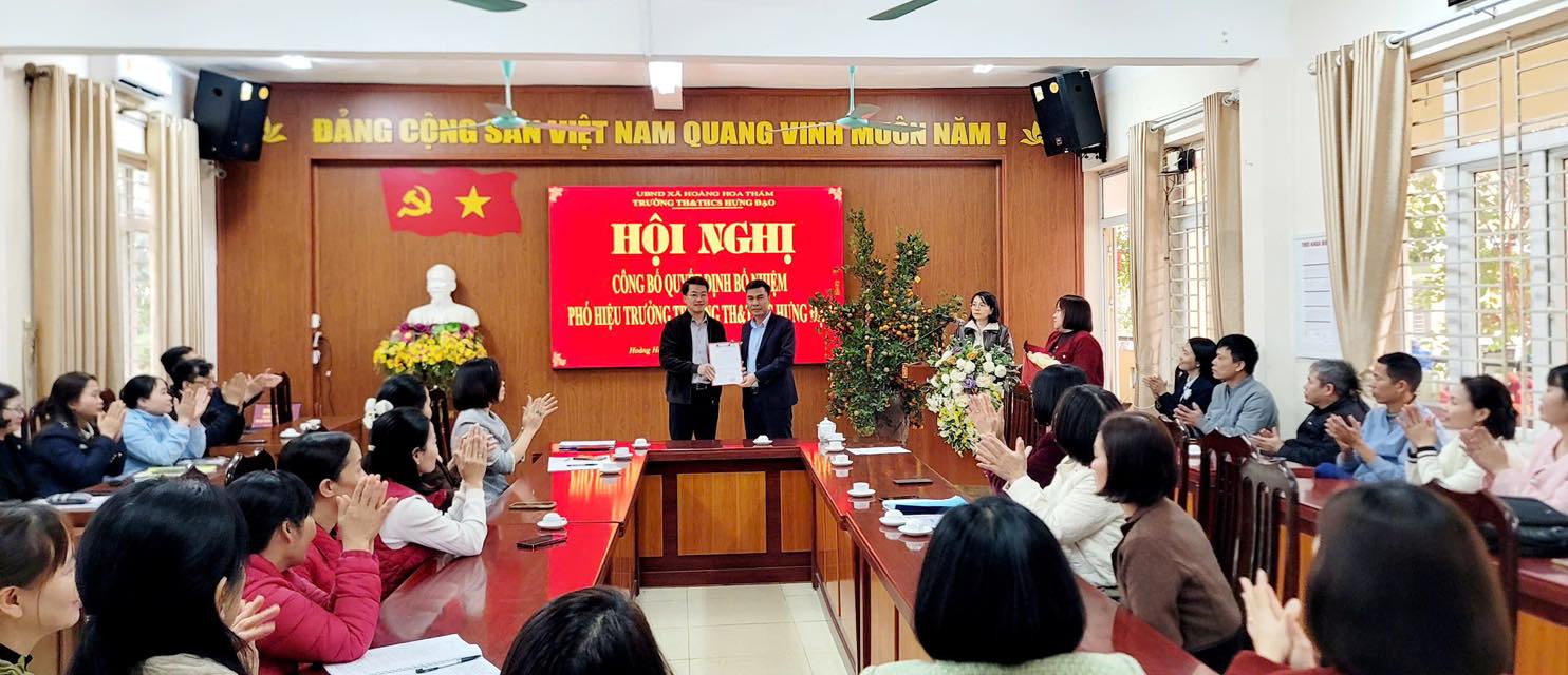 Tại Hội nghị, đại diện lãnh đạo xã đã trao Quyết định bổ nhiệm Phó Hiệu trưởng cho đồng chí Trịnh Quang Hợp. Phát biểu nhận nhiệm vụ, đồng chí đã bày tỏ niềm vinh dự, sự trân trọng trước sự tin tưởng của các cấp lãnh đạo; đồng thời khẳng định quyết tâm không ngừng học hỏi, đổi mới, đoàn kết cùng tập thể sư phạm nhà trường để nâng cao chất lượng giáo dục, xây dựng Trường TH & THCS Hưng Đạo ngày càng phát triển bền vững.