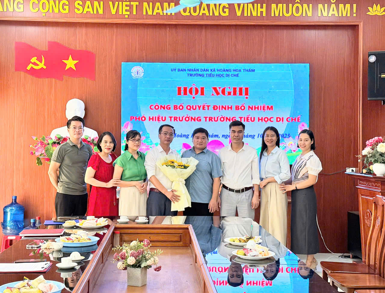 Sáng ngày 01/10/2025, tại Trường Tiểu học Dị Chế diễn ra Hội nghị công bố quyết định bổ nhiệm Phó hiệu trưởng. Theo Quyết định số 977/QĐ-UBND ngày 26/9/2025 của UBND xã Hoàng Hoa Thám, điều động và bổ nhiệm đồng chí Nguyễn Mạnh Hà (Phó hiệu trưởng Trường TH&THCS Hưng Đạo) giữ chức Phó hiệu trưởng Trường Tiểu học Dị Chế, thời hạn 5 năm, kể từ ngày 1/10/2025.