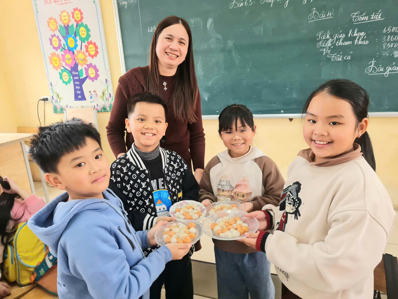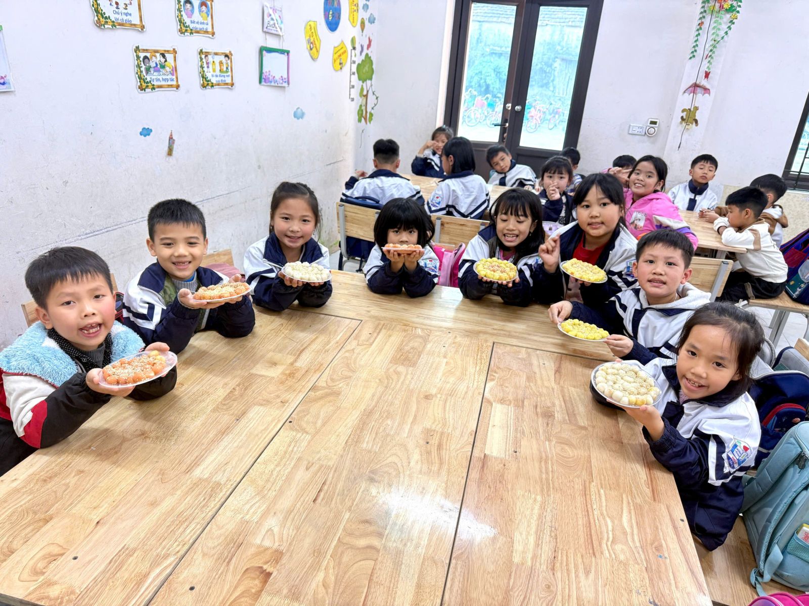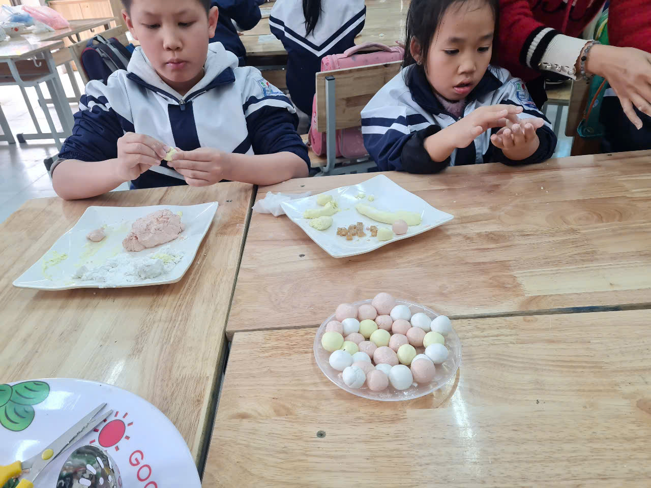 👩🏫 Từ những viên bột dẻo trắng, các em đã tỉ mỉ nặn từng chiếc bánh, cho nhân đường vào bên trong và cẩn thận viên tròn. Sau đó, bánh được luộc chín, nổi lên trên mặt nước và xếp ra đĩa, rắc thêm một chút vừng thơm. Thành quả là những đĩa bánh trôi xinh xắn, mang đậm hương vị truyền thống do chính tay các em tạo ra.